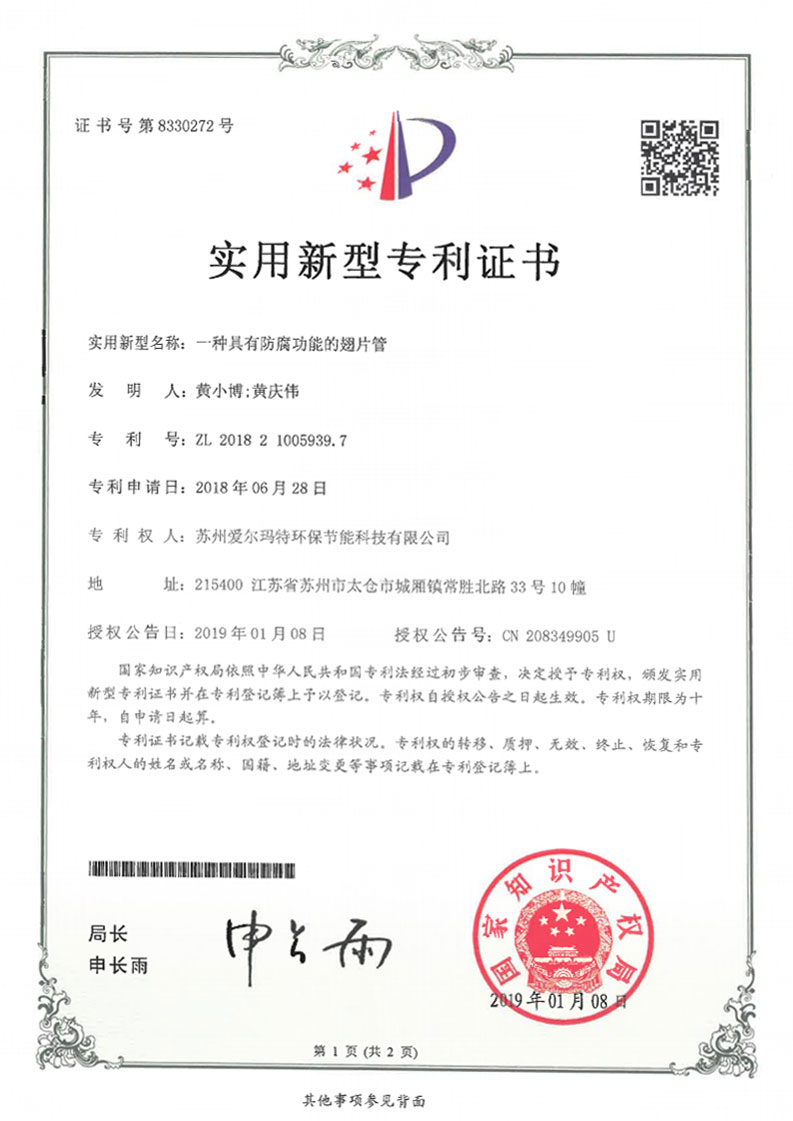 实用新型专利 一种具有防腐功能的翅片管